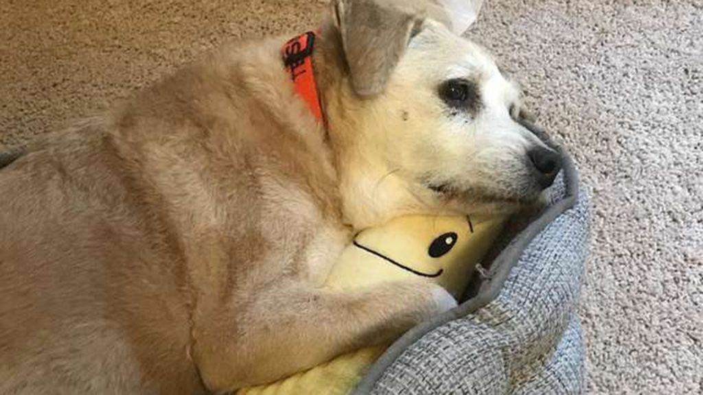 Úgy öleli plüssbanánját az aggastyán kutya, mintha nem lenne holnap