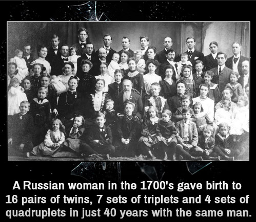 Persze nem sorban születtek, az a 40 évnyi házasság nem lett volna elég 69 gyerekre, hanem folyton ikrekkel áldotta meg őket a sors: 16 sima ikerpár, 7 hármasiker és 4 négyesiker teszi ki ezt az irdatlan számú gyermeket. A további 18 gyermek már csak hab a tortán a második házasságból, úgy tűnik, Mr. Vassilyev az ikrek mágusa volt: 6 iker és 2 hármasiker az eredmény.