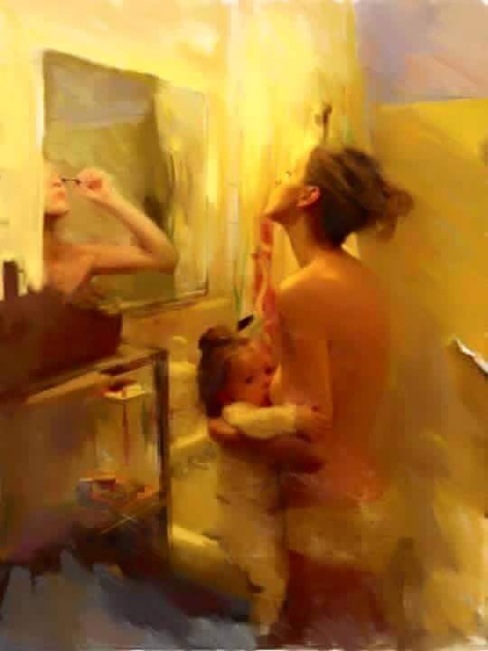 F: Korán kell felkelnie, mert ő irányítja a család reggeleit. Elkészíti a gyerekek tízóraiját, felöltözteti őket, ad nekik reggelit, ellenőrzi, hogy megfésülködtek, fogat mostak, bepakoltak a táskájukba. A babával együtt kel fel, hogy megszoptassa és átpelenkázza.