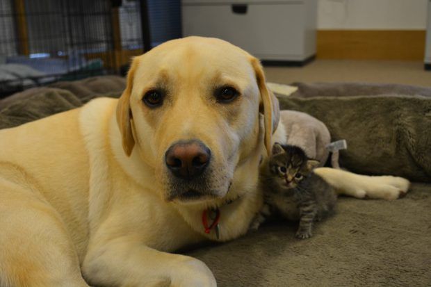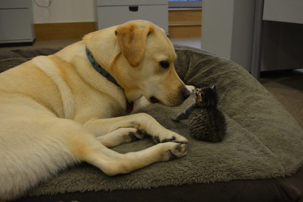Az Ava névre hallgató kismacskát egy londoni kertben találták meg, teljesen átfagyva. Az alig néhány napos cicát azonnal menhelyre szállították, ahol az ápolók üvegből, kézzel etették őt, így megmentve hajszálon függő életét. Itt találkozott Barney-val, a szeretetteljes labradorral.