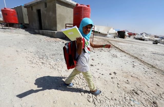 Egy kisfiú indul iskolába a menekülttáborból. Fotó: Delil Souleiman/Getty Images