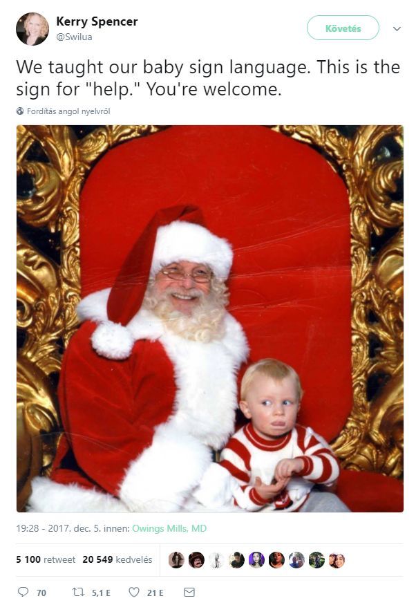 A képen első pillantásra, magyarázat nélkül nem látunk semmi különöset, maximum annyit, hogy a gyerek nem vág túl lelkes arcot. De amint elolvassuk az anyuka, Kerry Spencer kommentárját, máris leesik, mitől olyan vicces a fotó, amin a gyermeke, Samuel ül a Mikulás ölében.