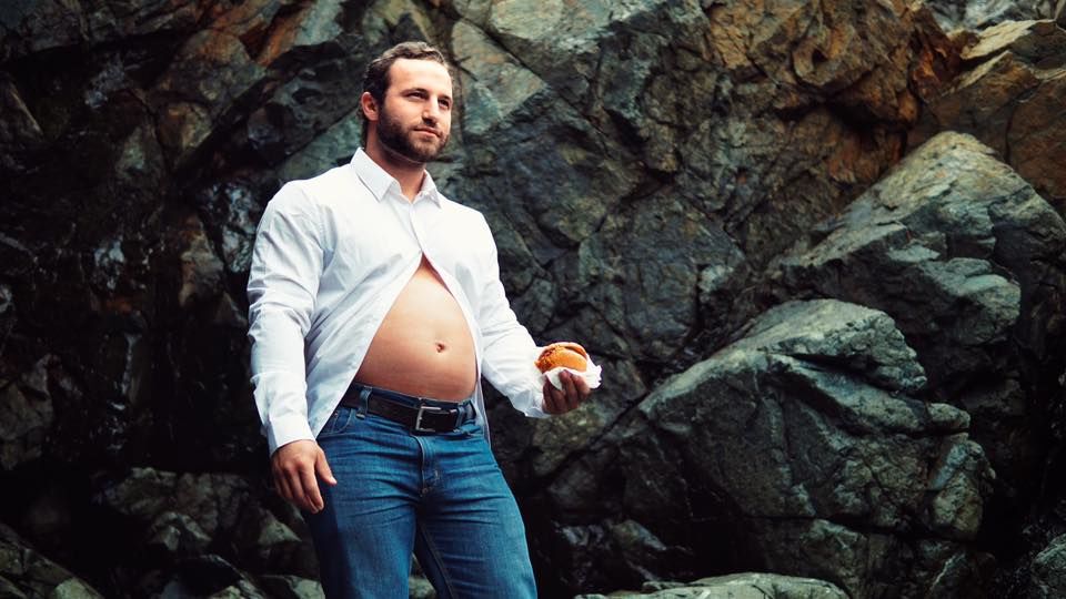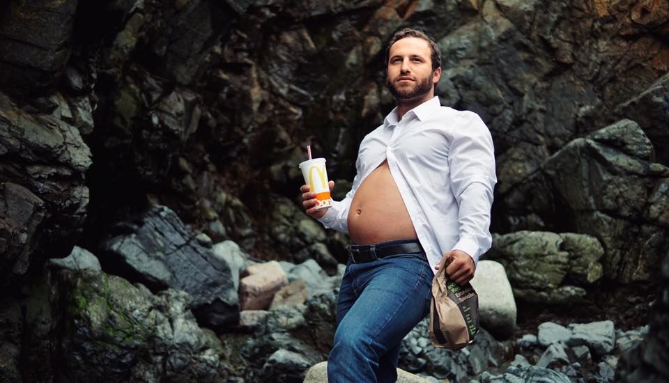 Hello srácok! Kiderült, hogy barátnőm babát vár. Úgyhogy a haverom, Stephen jött elő azzal az ötlettel, hogy készítsünk terhesfotókat… a főszerepben velem. Úgy éreztem, hogy az lenne a jó, ha legalább egy kicsit terhesnek néznék ki, ezért alaposan behamburgereztem a fotózás előtt. Ha teljesen őszinte akarok lenni, maga a fotózás, a beállítások, az alkalom és a duplasajtos burgerek okozta hascsikarás sokkal közelebb hozott a terhességhez, mint gondoltam. Azt persze sosem fogom megtapasztalni, milyen a szülés, de úgy érzem a szívem mélyén, hogy nem állhat messze attól mint amikor RENGETEG gyorskaját megeszel egyszerre. Hálás vagyok ezért az élményért.