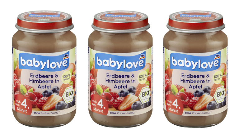 - A termék megnevezése: „Babylove bio gy. 4 hó 190g eper-málna-alma üveges bébiétel” („Erdbeere & Himbeere in Apfel”, 4 hónapos kortól)