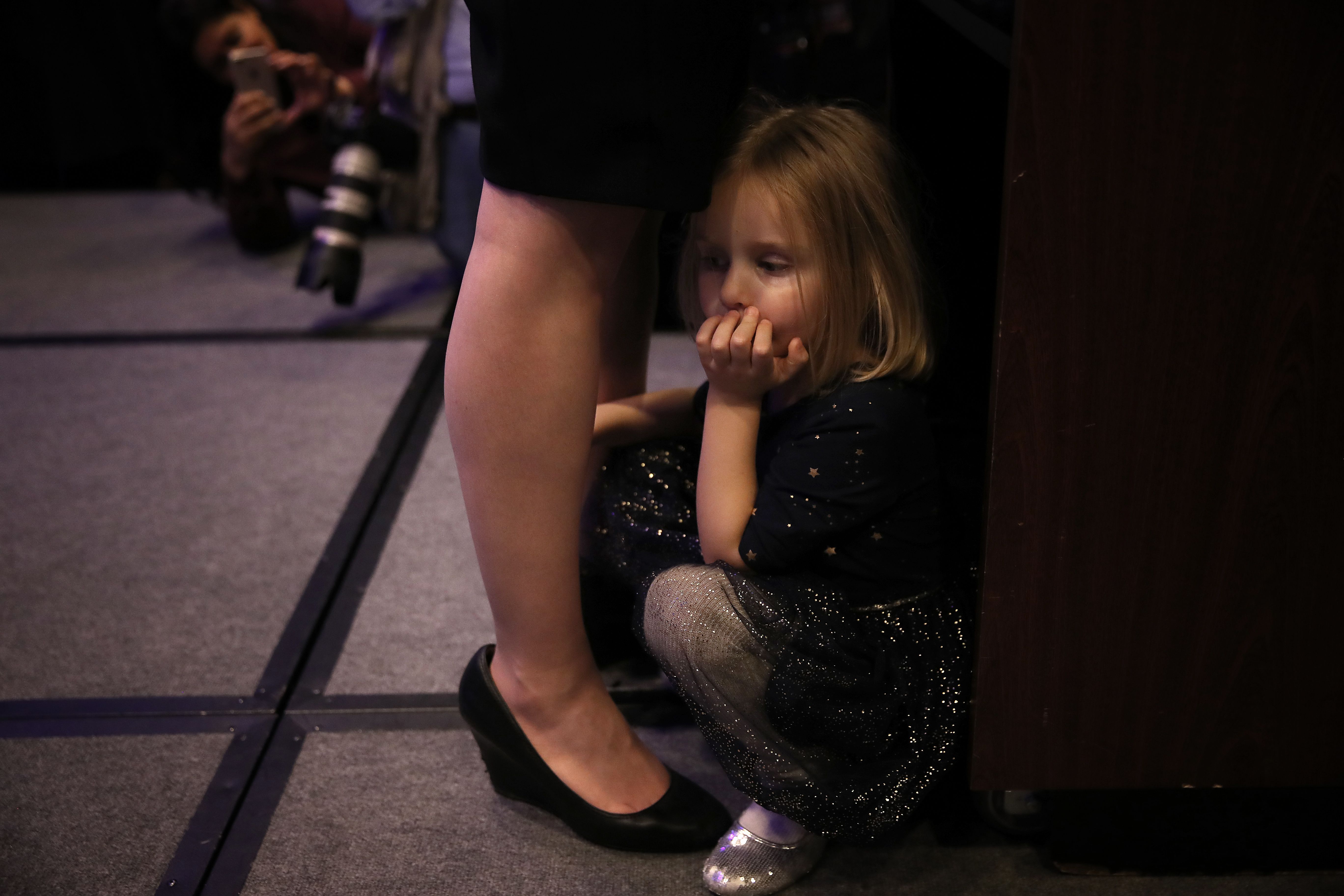 Egyikük, a 4 éves Catherine kisebbfajta magánszámot adott elő édesanyja beszéde alatt. Miután Spanberger beszélni kezdett, a kislány eltűnt a pódium mögött, az oldalt állok pedig jól láthatták, hogy a kislány édesanyja lába mellé kuporodott le.