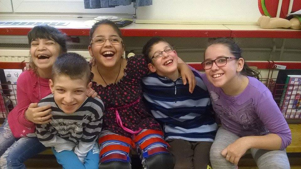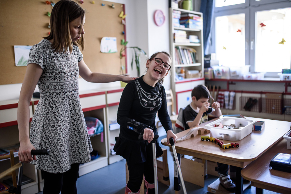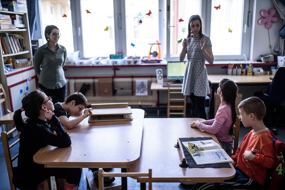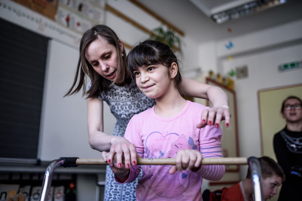 Az osztályterem előtt azt hiszem, rossz helyen járok. Akkora a zaj, hogy legalább húsz gyereket képzelek az ajtó mögé, pedig elvileg az ország egyik legkisebb osztályába, a Pető Intézet ötfős 3. a.-jába jöttem. Jó helyen járok: ők azok, ráadásul egyikük, Dia hiányzik. A két konduktor-tanító, Beatrix és Erika néni gyorsan megnyugtat: mindig ez van, ők öten (illetve ezek szerint négyen is) képesek hatalmas bulit összehozni egy amúgy nyugodt hétfő délután is.