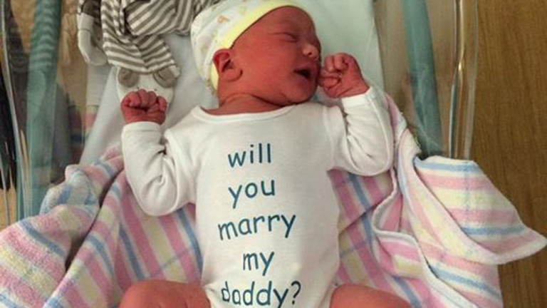 Újszülött babájuk segítségével kérte meg a párja kezét – fotó