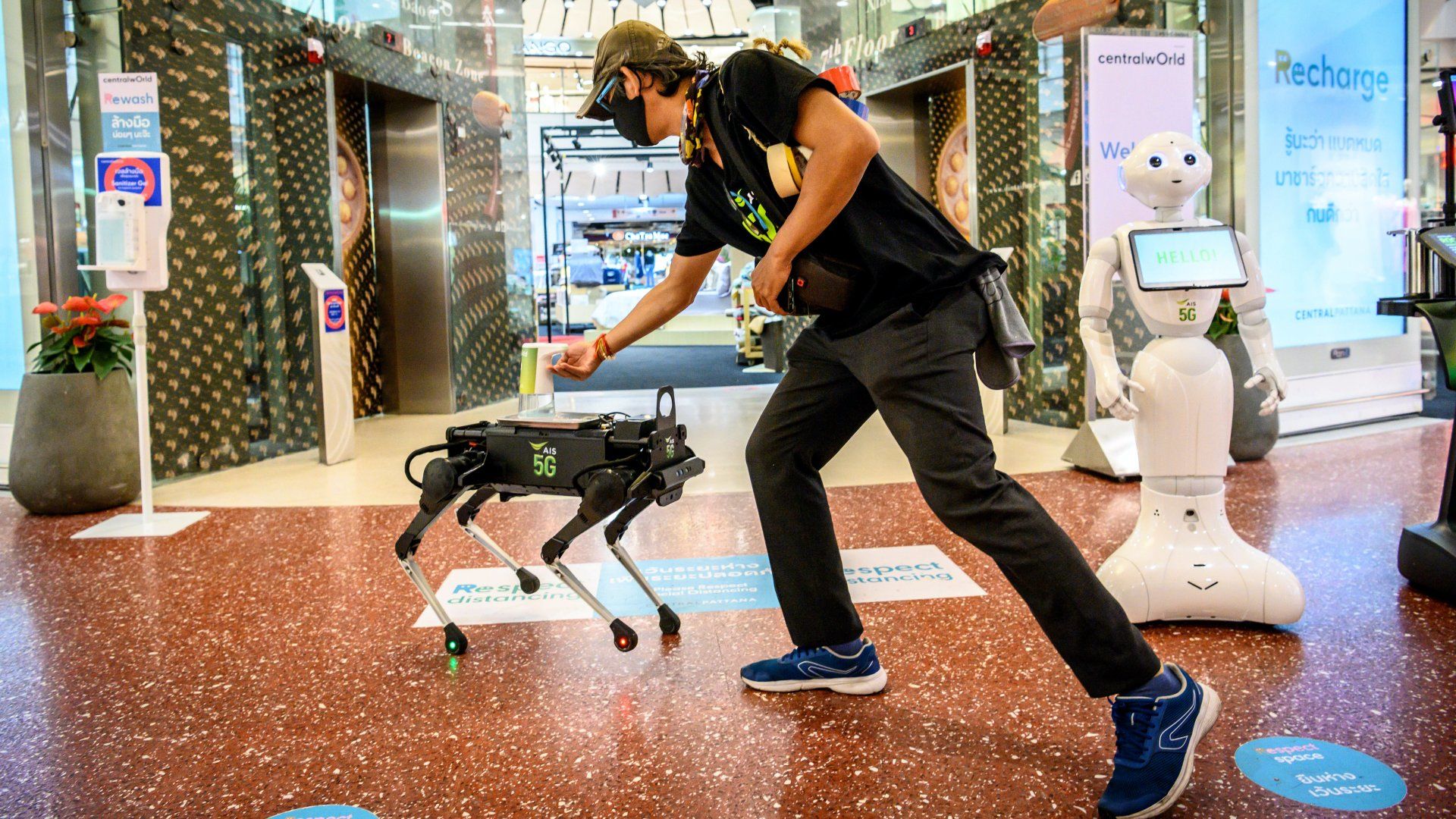 Robotkutya biztatja kézfertőtlenítésre a bevásárlóközpont látogatóit