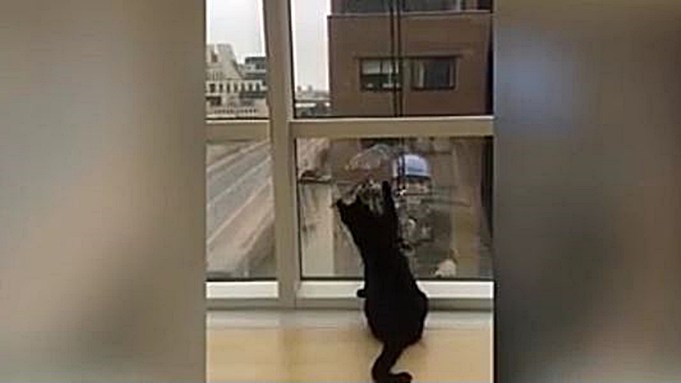 Megőrjítette a macskát az alpinista ablakmosó – vicces videó