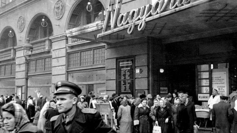A Corvin Áruház kirakata előtt ’56-ban nagy tömeg gyűlt össze