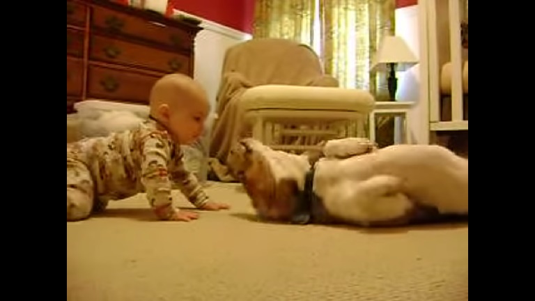 A kisbaba és a kiskutya első találkozása – cuki videó