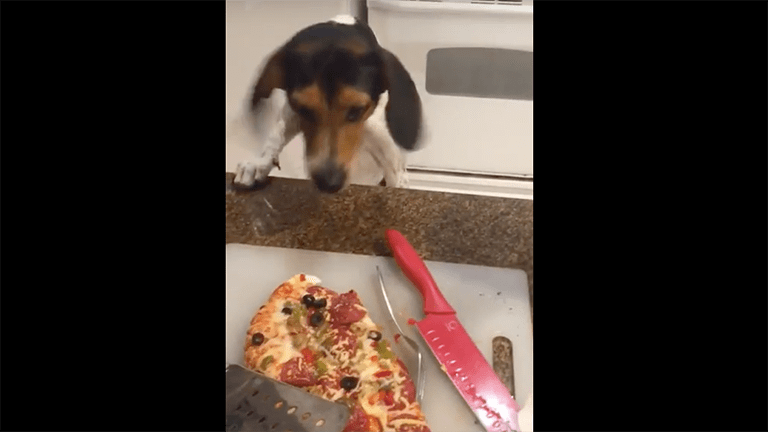 Rugólábbal próbálja elérni a pizzát a pöttöm kutya – videó
