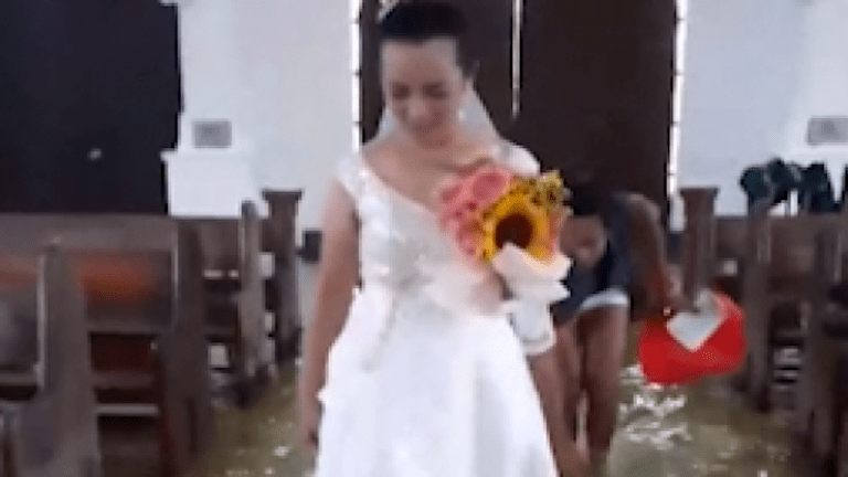 A monszuntól elárasztott templomban tartotta az esküvőjét egy fülöp-szigeteki pár – videó