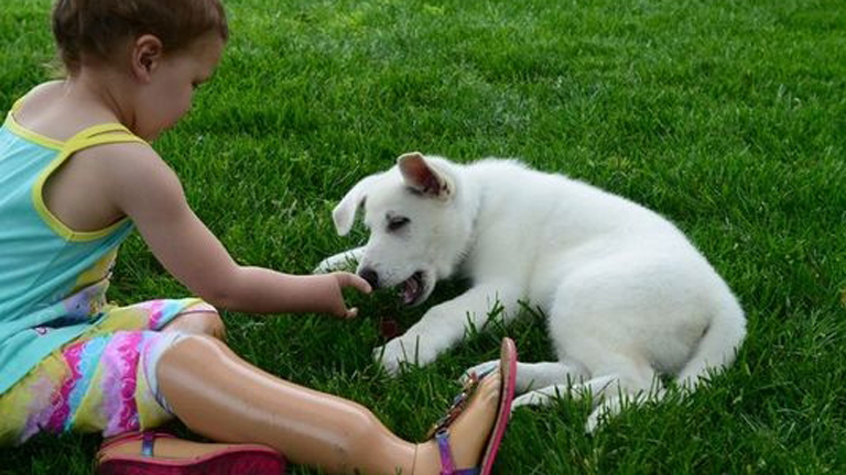 Hiányzó mancsú kutyát kapott az amputált lábfejű kislány