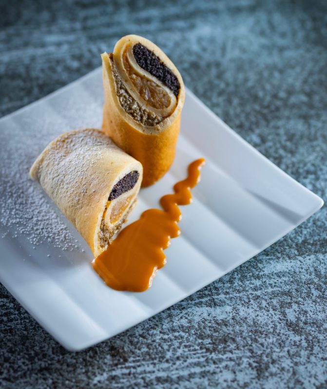 A flódni ízei palacsintába tekerve: fontos, hogy olyan vastagságú palacsintát süssünk, ami megtartja az almás-mákos-diós tölteléket. Ha nem volna még elég a jóból, saját készítésű sós karamellás öntettel is gazdagíthatjuk.