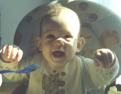 Az étkezések lassan bekúsztak a napirendünkbe. Együtt örülünk annak, hogy Balázs már pohárból iszik, önállóan tud gyümölcsöt, kenyeret és húst enni, bár az almát kis hörcsög módra addig tömi magába, amíg van a szájában hely, s csak azután hajlandó lenyelni.