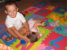Késő délután lett, mire Balázs és Dóri végre zavartalanul játszhattak együtt. Kezdetben ez leginkább abból állt, hogy Dóri megpróbálta minél többször megnyalni Balázs játékait, beleértve a cipőjét és a pofiját is, bár ez utóbbit lehet, hogy puszinak szánta. Balus közben azon buzgólkodott, hogy kicsenje Dorka kezéből a habtapi figurákat, amiket előzőleg kiügyeskedtek a színes állatos és virágos szivacsszőnyegből. Később a játék annyiban módosult, hogy Balázs megpróbálta visszahúzni az elkóborolni próbáló babát, de néhányszor olyan hirtelen mozdultak, hogy csak a puha szőnyeg óvta meg Dórika fejét egy alapos koppanástól.
