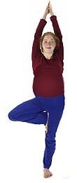 A jobb lábra nehezedünk, a bal lábunkat lefelé tartott lábfejjel a jobb láb belső oldalán addig húzzuk fel, amíg kényelmes, és stabilan meg is tudunk állni.