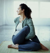 Leülünk a talajra, keresztbetett lábakkal, majd elvégzünk egy nagyon egyszerű, ám nagyon hatásos gerinccsavaró gyakorlatot, a parsva siddhasanat.
