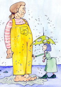 Tintilla szerint ezek olyan jelek, amiket nem lehet szó nélkül hagyni. Nem is hagyta, egyenesen Domonkosnak kiabálta, hogy – Hallja-e, hát maga a legnagyobb itt az utcában, ugyanmá’, találja ki, hogyan járhatnánk a dolgok végére! De Domonkos meg se hallotta szegény kis tündérlány kiabálását. Domonkos ugyanis zokogott, sírt, mint a záporeső, úgyhogy többek között Teréz, a boltoskisasszony és képzett gyógyfüves vajákos asszony esernyővel lépett ki az utcára. Csak akkor lepődött meg igazán, amikor az esernyőjén körben sűrűn szabályos tenyérnyi lyukak tátongtak.