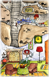 És ha már szerda, akkor az különös idő, hiszen a szerdáknak oka van a Kék utcában, csak úgy ukk-mukk-fukk nincsen itt szerda, tudjuk jól. Szóval végül is szerdán délelőtt Mártika egy jóképű, kék színű mackónadrágban, fején biciklis sisakkal, kezében egy óriási elemlámpával bemászott a kandallóba. Igencsak elcsodálkozott, amikor a kémény felé kiegyenesedve egy kis létrát vett észre a falba erősítve. Csodálkozott, viszont nagyon is megörült, hiszen egyből indulhatott fölfelé. Rövid mászás után észrevette, hogy a létra kétfelé vált, egyik része ment tovább fölfelé, másik része pedig jobbra egy vízszintes üregbe kanyarodott. Mártika természetesen a kanyarodós irányt választotta, és bebújt az üregbe. Négykézláb mászott egy jó darabig, aztán megállt, zsebéből előhalászott néhány mentolos csokipasztillát, amit előző délután vásárolt Karcsinál. Imádta a mentolos csokipasztillát, sajnos nagyon imádta. Ezen töprengett éppen, amikor észrevette, hogy távolabb, az üreg végén valami kis tábla lóg a falon. Azonnal elrakta a maradék pasztillát, és mászni kezdett a fehér tábla felé.