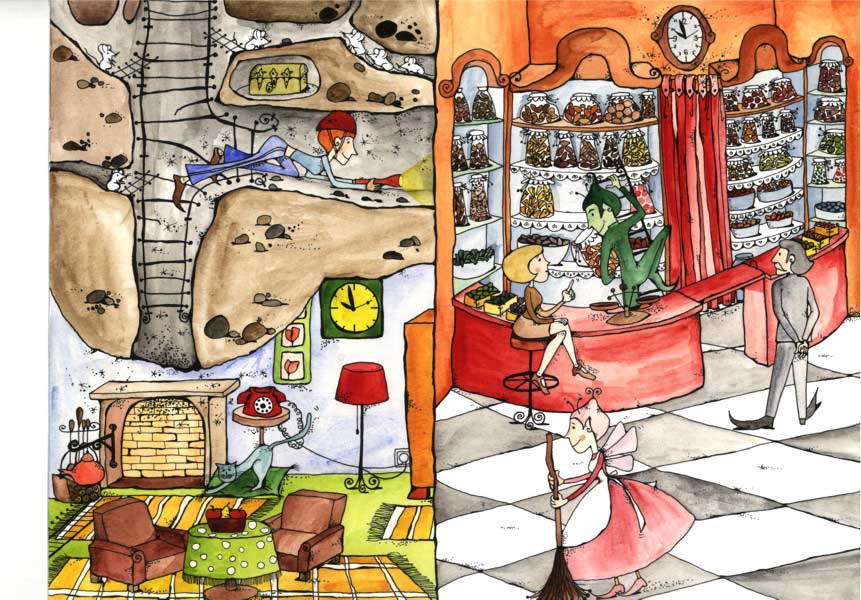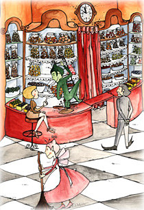 Karcsi kócerájának tehát Tintilla is örült. Egyből jelentkezett is a zöld koboldnál, mint távoli rokon, hogy akkor ő beállna hozzá pár jó szóért, és árusítana, üzletet söpörgetne, csomagolna fényes sztaniolba, vagy bármi, ami kell egy ilyen csokiillatú, imádnivaló kócerájban. Ám Karcsi határozottan megtiltotta Tintillának, és bárki másnak is, hogy az üzlete közepén levő, pirosra festett pulton túl merészkedjen. Még Domonkos sem leshetett be mögé, hiába volt olyan behemót. A pult mögött először is tükrös szekrények voltak, azokban magas dunsztosüvegek telis-tele bonbonokkal, aztán alattuk levesestál nagyságú kristálytálak, amelyekben csokipasztillák tornyosultak, derékmagasságban a pulton dobozkák sorakoztak fényes papírba burkolt drazsékkal és cukorkákkal. És előttük ott vigyorgott Karcsi, aki gyors volt, mint egy gyík, és szemfüles, és bizonyos dolgokban kérlelhetetlen. Abban például, hogy a szekrények melletti, vastag függönnyel takart ajtón senki be nem léphetett.