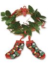 Nagy átmérőjű (legalább 40 cm) szalmakoszorú, örökzöld ágak, piros, zöld, arany kötöző, textilzsákocskák, apró ajándékok