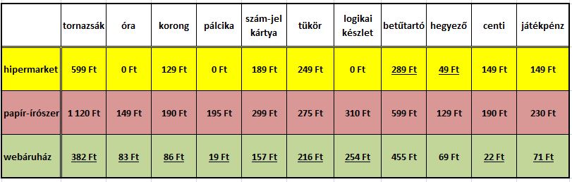 A papír-írószer bolt egy átlagos kisvárosban van, a hipermarket pedig a 19 forintos füzetáraival csalogatott oda minket – ahogy vélhetően másokat is. Az árakat összegyűjtöttük és táblázatba foglaltuk a könnyebb átláthatóság kedvéért. Minden üzletben az elérhető legolcsóbb terméket választottuk. A táblázatban az olcsóbbakat aláhúztuk.