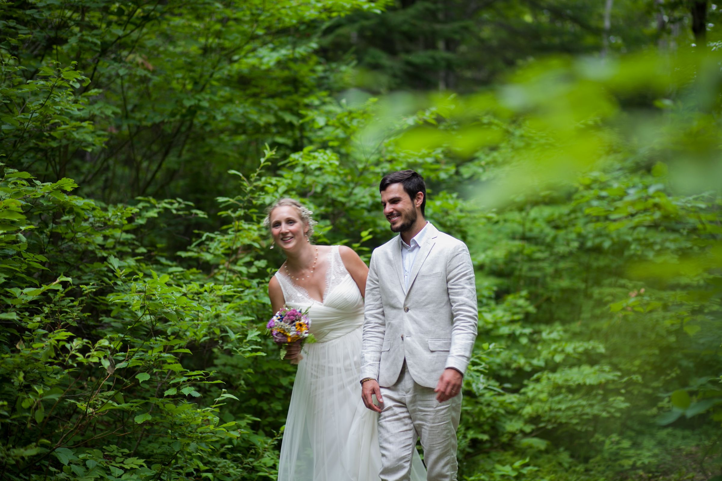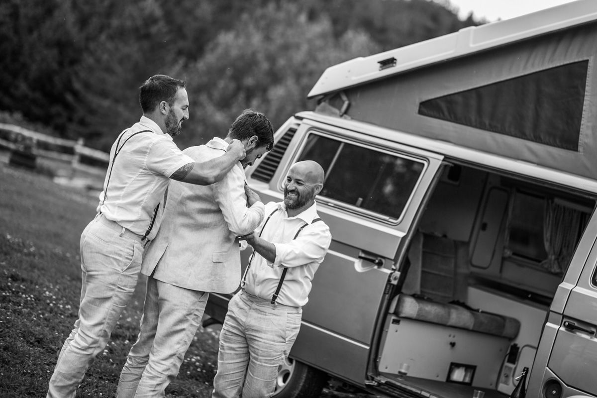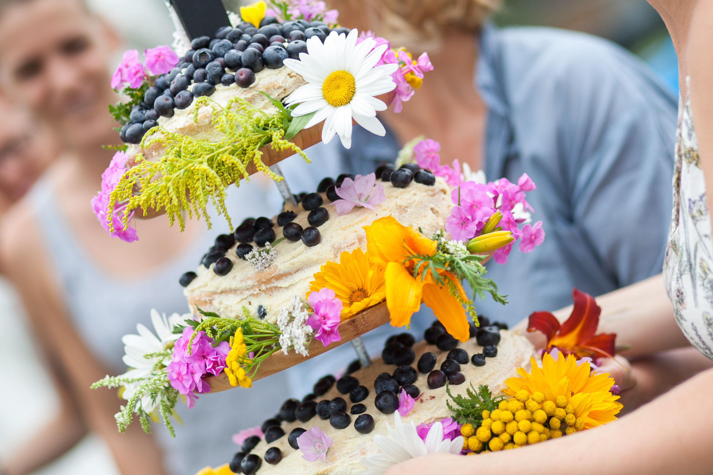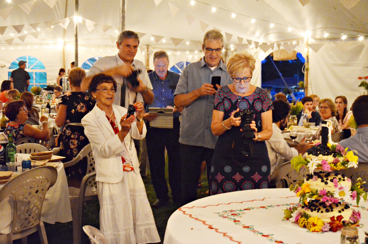 A dekoráció természetes anyagokból készült, a tányérok komposztálható pálmalevélből. Megható volt, az általuk tervezett kétnyelvű szalvétán látni a „legfontosabb” kifejezéseket magyarul és franciául. A szúnyogokat a levendula, rozmaring tartotta távol, üvegekben vízen úszó gyertya égett. A vendégek köszöntése nyolc nyelven volt kiírva egy raklapra. Vadvirágok díszítették az asztalt és a felületeket, amit a környező mezőkről az ünnep előtti órákban, tréningruhában együtt szedett a kanadai–magyar család apraja-nagyja. A csokrot is mezei virágból készítették, Anna keresztanyja és unokatestvére kötötte. A tortát ketten sütöttük Annával, háromemeletnyi krém és gyümölcs. A dísz egy óriási facsipeszből készült, a középső lányom, Eszter készített belőle egy menyasszony-vőlegény babát, amit a tetejére biggyesztettünk. A vőlegény nővére, Mirjam elvégzett egy tanfolyamot azért, hogy levezethesse a szertartást. Annát a húgai sminkelték és öltöztették, Olivier-t a bátyjai „igazgatták”. A két kisebbik lánykám pedig lelkesen gyakorolta a magyar ajándékdalokat, amit gitárral kísérve énekeltek el az ifjú párnak.