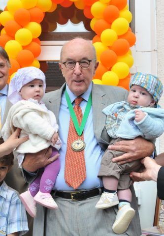 Kaáli Géza orvosprofesszor, az intézet alapítója tartja karjában az intézet húszezredik megfogant gyermekeit a Kaáli Intézet megnyitásának 20. évfordulója alkalmából rendezett ünnepségen. (Fotó: MTI)