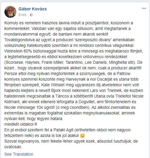 Kovács Gábor producer Facebook-posztjában arról ír, hogy valószínűleg hatékonyabban működik Amerikában a szereposztó dívány, mint itt, Magyarországon. Példaként a szexuális erőszakkal többszörösen megvádolt Harvey Weinstent említi, aki „80 százalékos biztonsággal hozta létre minőségi és meghatározó filmjeit”.