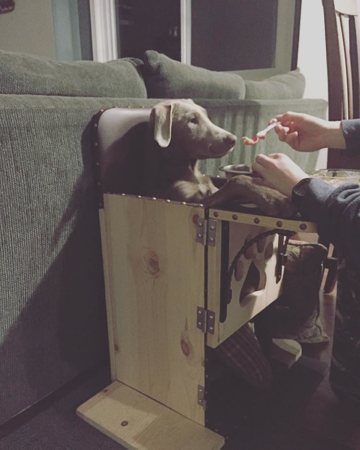 Kiderült, hogy Tink sosem fog tudni a hagyományos módon enni, de szerencsére azért akadt egy megoldás: az úgynevezett Bailey-etetőszék függőlegesben tartja a kutya testét evés közben, így a gravitáció segítségével érhet le az étel az állat gyomrába. A beteg kutyus naponta többször, kis adagokat eszik az etetőszékben, és bár a család sokat foglalkozik speciális igényeivel, ők ezt egyáltalán nem bánják – most is nagyon boldogok, amiért Tink az életük része lehet.