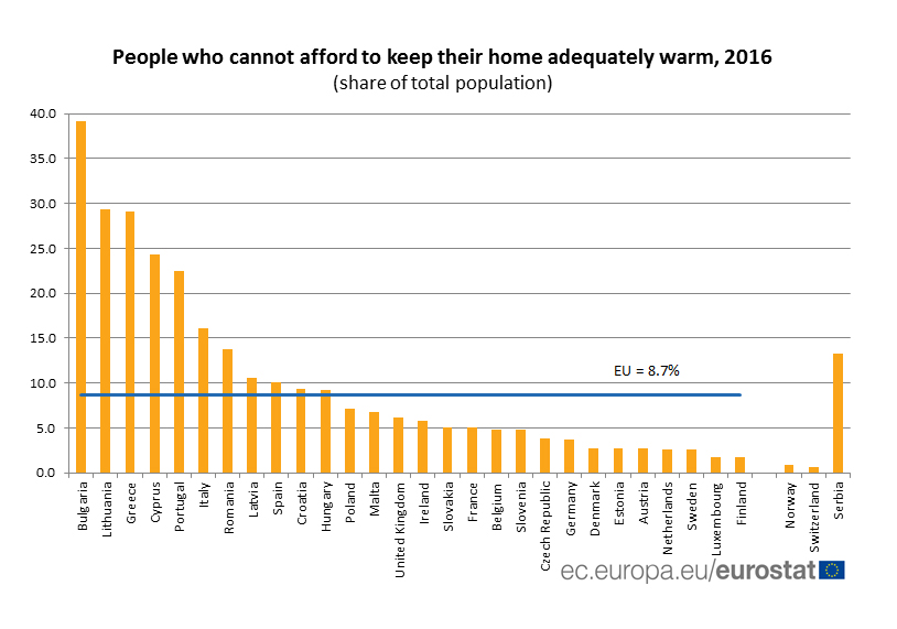2012-ben még az ország lakosságának 15 százaléka nem tudta rendesen felfűteni a lakását télen, míg a legutóbbi felmérés alatt már csak a lakosság 9,2 százaléka, nagyjából 900 ezer ember fagyoskodott a téli hónapokban az Eurostat közlése szerint. A helyzet 2009-ben volt a legjobb, akkor csak 8,9 százalék fagyoskodott.