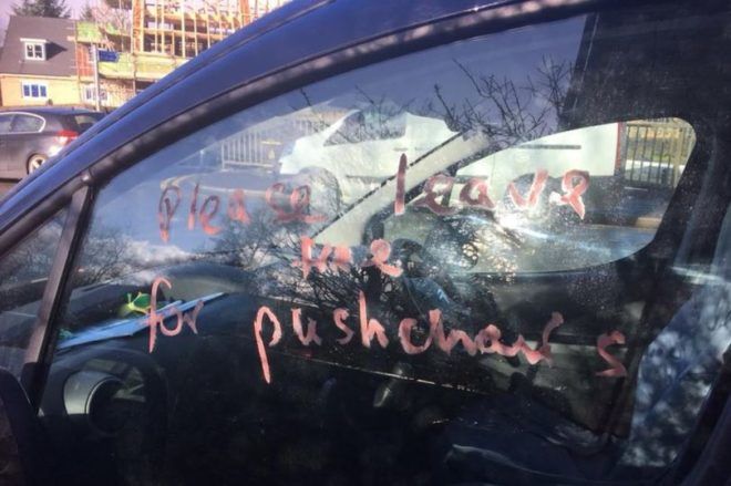 Lucy Greenwood, manchesteri édesanya, valahol a két reakció között tette le a voksát: pink színű rúzsával jól látható feliratot hagyott a rosszul parkoló autón, hogy ugyan legyen szíves szabadon hagyni a járdát a babakocsit tolókra tekintettel.
