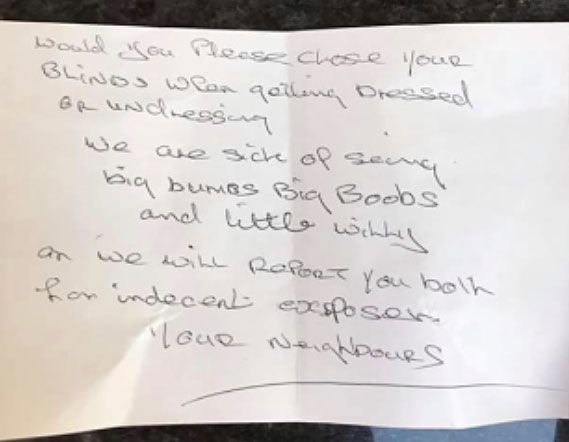 Az üzenetben az áll, hogy legyenek szívesek a jövőben öltözködéskor elhúzni a függönyüket, mert szomszédjuknak semmi kedve a nő nagy mellét és fenekét, valamint a férje kis péniszét bámulni. Karint és Jayt felháborította a névtelen üzenet, ezért is hozták nyilvánosságra történetüket.