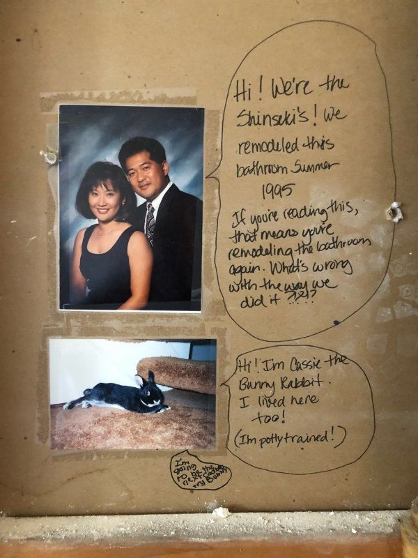 A 23 évvel ezelőtti üzenet egy kedves fiatal pár fotójával kezdődött. „Helló, mi vagyunk Shinsekiék! 1995 nyarán újítottuk fel a fürdőszobát. Ha ezt olvasod, azt jelenti, hogy megint felújítjátok. Mi volt a baj vele?!?!”