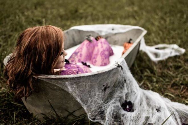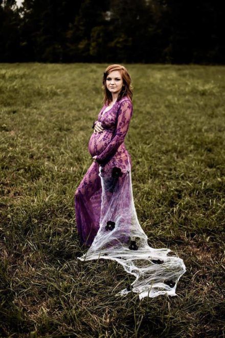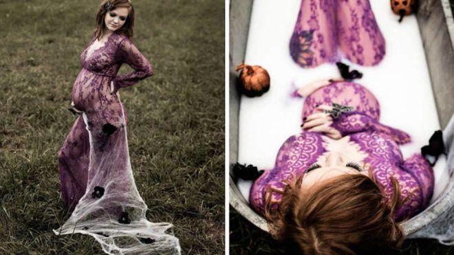 Az extravagáns leendő anyuka egy merész, ámde meseszép csipkeruhát választott a terhesfotóihoz, amelyet kísérteties pókhálókkal egészített ki. A fotókat egy régimódi, tejjel töltött kád egészítette ki, amelyben az őszi hangulathoz hűen tökök úsztak.