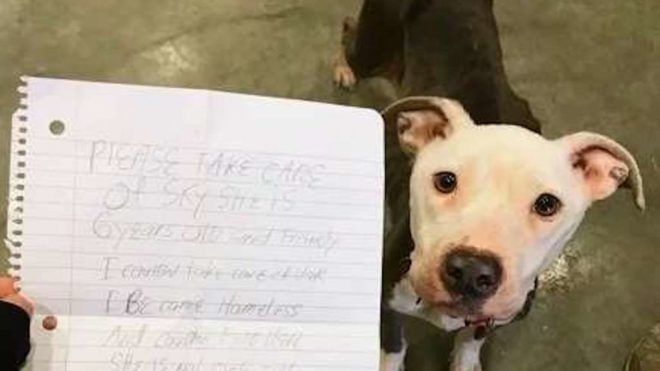 Skynak, a 6 éves kutyának kilátszottak a bordái, mikor a delaware-i menhely előtt rátaláltak. A kutyusnál egy levél is volt: ebben gazdája elmagyarázta, hogy azóta nem tud rendesen gondoskodni a kutyáról, mióta az utcára került. A levélben arra kéri a menhelyet, találjanak otthont a kutyának.