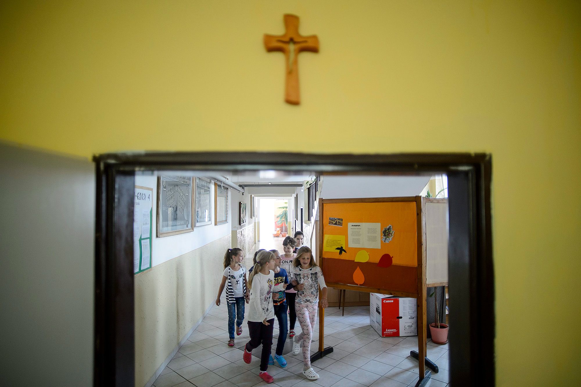 Tanulók mennek a folyosón a Boldog Salkaházi Sára Magyar Tannyelvű Egyházi Óvoda, Alapiskola és Gimnáziumban. MTI Fotó: Komka Péter