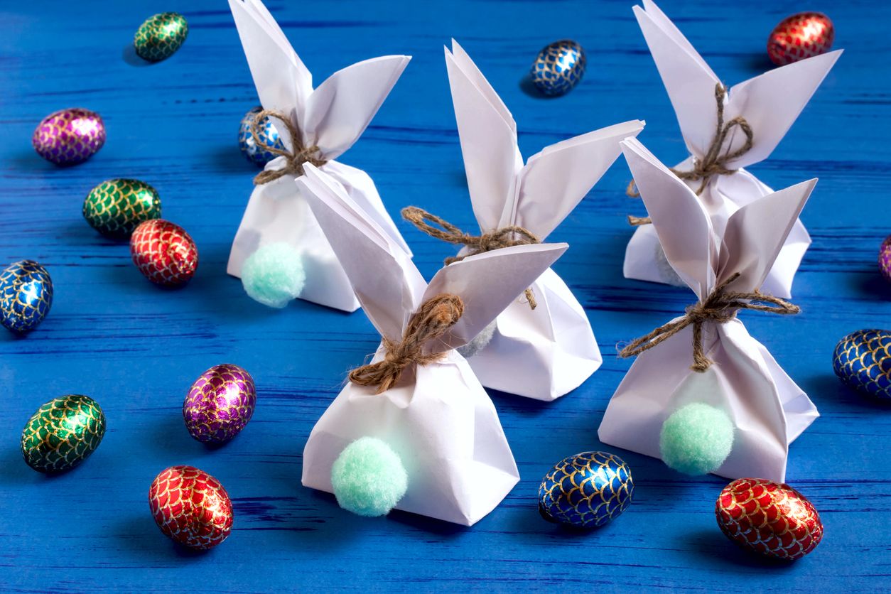 Egyszerű fehér lapból készülnek ezek a nyuszik, belsejükben pedig apró csokitojásokat rejtenek. Ha meg akarjuk lepni a gyerekeket, ez tökéletes választás lehet. Már csak azért is, mert a kicsik élénk fantáziája a kevésbé jól sikerült példányokat is csodálatos ajándékká varázsolja.