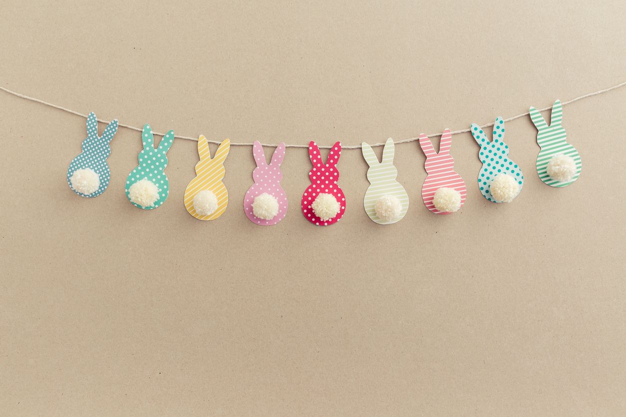 Mindössze egy sablonra van szükség, és sok színes papírra, na meg lelkesedésre, és máris készülhet a nyuszifüzér. Apró bojtokkal még cukibbá tehetjük a dekorációt. A legegyszerűbb, ha a fülüknél fogva ragsztjuk fel a kivágott nyulakat.