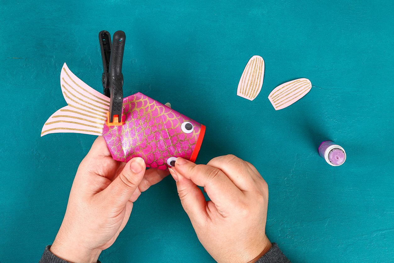 Következhet a ragasztás. A hal farkát beragasztózzuk, és a helyére illesztjük, majd szorítócsipesszel rögzítjük. A szemeket ugyancsak ragasztózzuk, és elhelyezzük a henger felső részen. Ha inkább rajzolni szeretnénk a szemeket, válasszunk erőteljes színt. A szájat ugyancsak ragaszthatjuk, körbe a guriga szélén, akár piros szigetelőszalagot felhasználva, de sokkal könnyebb egy erős piros filctollal megrajzolni.