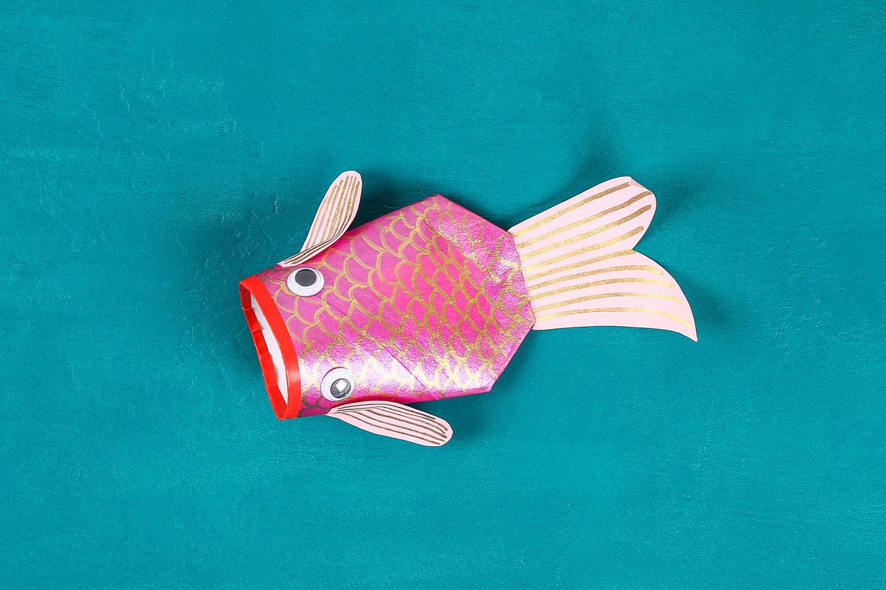 A papírgurigát fessük be csillogós festékkel, és hagyjuk megszáradni. Közben vágjuk ki papírból a hal farkát és két uszonyát. A színes tollal rajzoljuk rá a mintákat. Ha megszáradt a befestett tekercs, varázsoljuk rá tollal a pikkelyeket. Ha ezzel is megvagyunk, a tekercs alsó részén, a két szélén nyomjuk be az oldalakat.