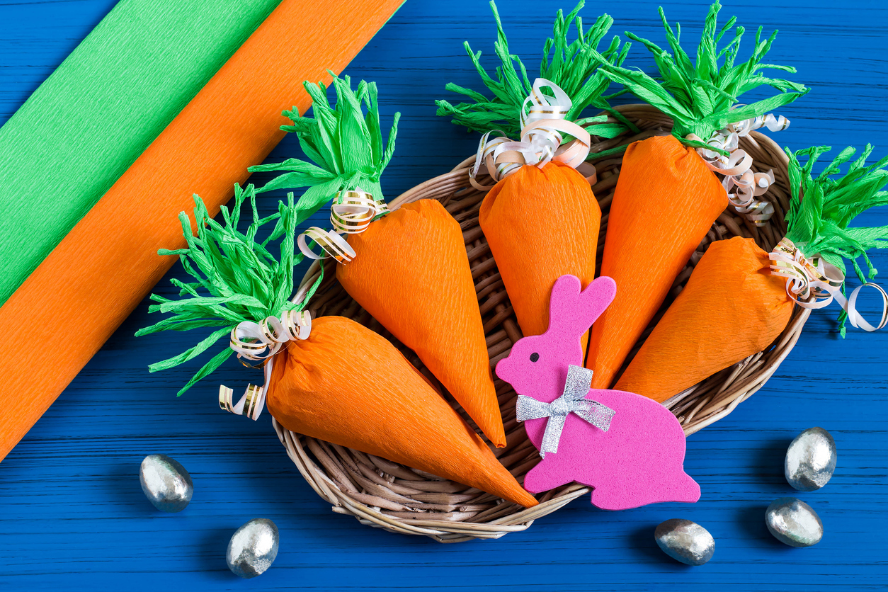 A színes, krepp-papírból készült répákat minden gyerek szívesen készíti. Ugyan a kivitelezés nem egyszerű, de ha készen vannak, izgalmas díszei lehetnek a húsvéti asztalnak.