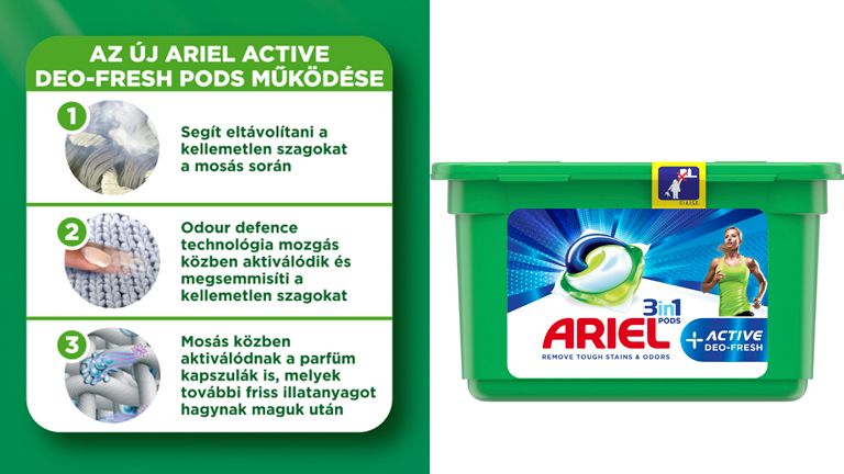 Az új Ariel Active Deo-Fresh PODS mosókapszula nemcsak rendkívüli tisztaságot biztosít, hanem egyedülálló, szagvédő technológiájával megsemmisíti a kellemetlen szagokat mosás közben. A hozzáadott parfümanyag használat közben aktiválódik, így hosszan tartó frissességet biztosít. Nem szükséges ismételt mosás, hogy a sportruházatból és egyéb szintetikus ruhákból a kellemetlen szagokat megpróbáljuk száműzni.