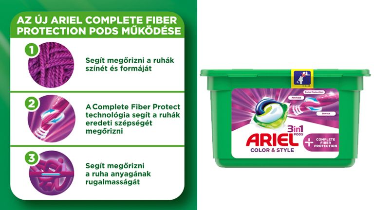 Mindannyian azt szeretnénk, hogy kedvenc ruhadarabjaink megtartsák minőségüket, ragyogó színüket, és élettartalmuk a lehető leghosszabb legyen. Az Ariel másik fejlesztése, az Ariel Complete Fiber Protection mosókapszula teljes szálvédelmet nyújt, így segít megóvni a ruhák színét, formáját és rugalmasságát. Az egyedülálló, három részből álló kapszula tartalma eltávolítja a foltokat és a szennyeződést, segít megóvni a ruhát a szennyeződés újralerakódásától, a fehér nem szürkül el, a színek élénkek maradnak.