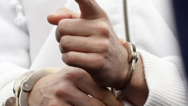 A harmadrendű vádlott megbilincselt kezei az olaszliszkai emberölés ügyében tartott helyszíni tárgyaláson 2009. október 27-én (Fotó: MTI / Vajda János)