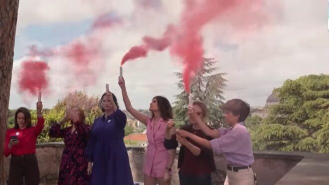 A következő pápáról szóló, szerda délutáni szavazás kezdetén, az Egyesült Királyságban működő Katolikus Női Ordináció (CWO) női tagjai rózsaszín füstöt eregettek a levegőbe a római, Szent Péter-bazilikára néző Gianicolo-dombon. Az aktivisták ezután a
