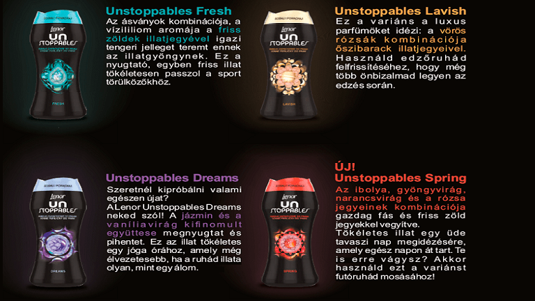 A Lenor Unstoppables illatgyöngyei nem károsítják az anyagot, így a tökéletesen alkalmasak sport- és egyéb, funkcionális ruhák mosására, amelyek erősebben igénybe vett felhasználásuk miatt gyorsabban magukba szívják a kellemetlen szagokat.