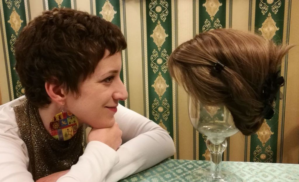 Tudtam előre, hogy ki fog hullani, ezért felkészültem rá. Megvettem a parókát, és rövidre vágattam a hajamat, hogy ne legyen akkora sokk az elvesztése. Azt mondták, a hajam csomókban fog a párnán maradni reggelente, ami egyértelmű betegségjel, és borzasztó élmény lehet. Én ezt nem akartam megvárni, és a hajamat is meg akartam tartani, ezért az első kemót követő harmadik héten, mikor már éreztem, hogy jönnek ki a hajszálak, úgy döntöttem levágom. Épp akkor volt itt az olasz párom, Luca a hétvégére, addig kontyba fogtam fel a hajam, amit nem bontottam már le. Mikor vasárnap elment, kiszedtem a csattokat, egyesével levágtam a tincseket, majd szilikongumival összegumiztam őket. Ami maradt a hajból a fejemen, azt a következő zuhany levitte. Másnap a levágott hajamat felapplikáltam egy csini piros turbánra, hogy ne kelljen minden nap a parókát hordani. Ezzel pl. a hajamat illetően a saját kezembe került az irányítás, nem sodródtam az eseményekkel.